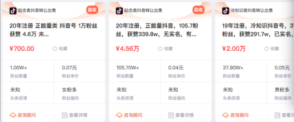 企业、商家这般想法,恰恰也被灰产机构看到。一些机构通过大量噱头视频内容来“养号”,再根据企业、商家的需求,诱导用户关注、形成粉丝数据,最终在网络上大范围兜售所谓“现成”的直播账号。