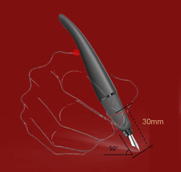 这款钢笔主要通过笔杆上半部的大曲线及笔身重心设置,来规范书写者的握笔角度。