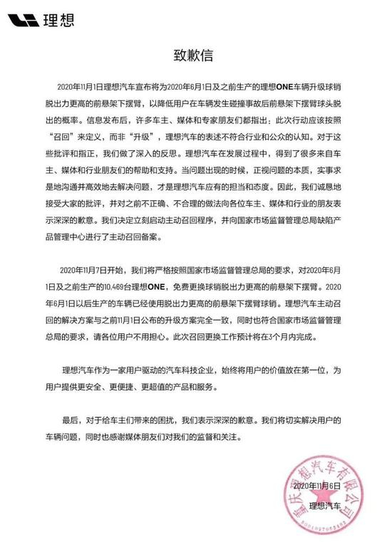 这一事件持续发酵了5天,在11月6日下午理想汽车发布了一封《致歉信》,信中表示将此前的“升级”表述改为“召回”,并正式宣布召回2020年6月1日之前出厂的10469辆理想ONE汽车,召回更换工作预计在3个月内完成。