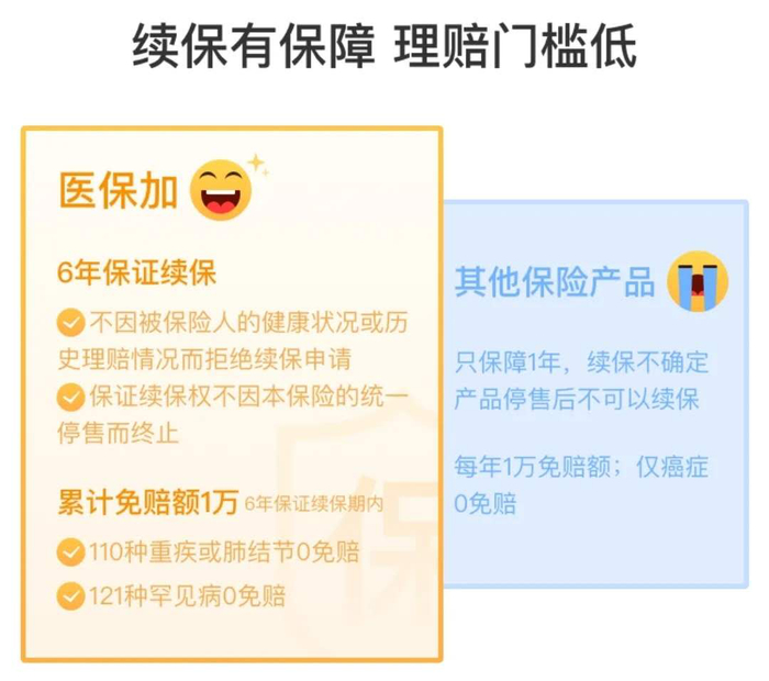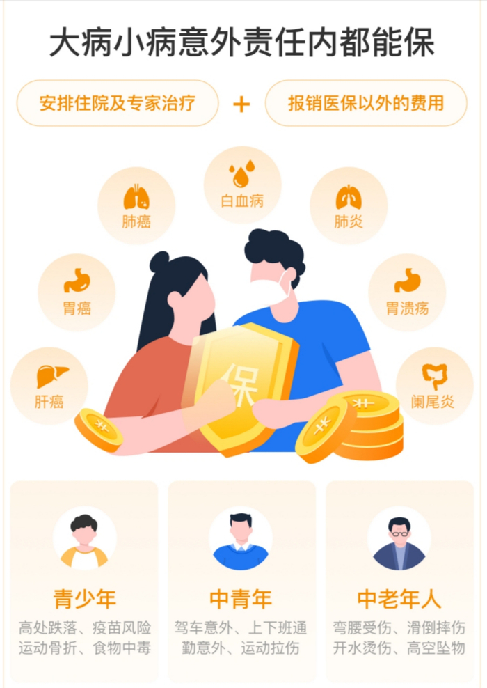 一年付款不到200元,可以享受的医疗保险范围:从胃病、胃溃疡、阑尾炎、肌肉损伤、摔伤等小病,到食物中毒、肺炎,白血病,癌症、新冠肺炎等重大疾病,保赔范围包括110种重大疾病0免赔,多种罕见病0免赔,肺结节0免赔。确诊110种重大疾病,“6年保证续保期内”可以豁免后续保费,责任内还有重疾住院津贴100元/天(最高180天/年)。