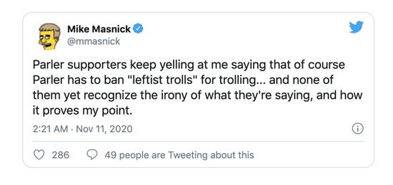 涌进Parler的是一群相信自己被区别对待了的人。
