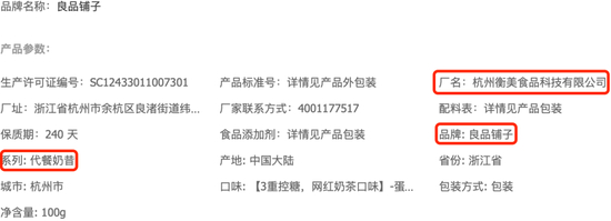 “良品飞扬”的蛋白代餐奶昔天猫售价89元(6个),不仅产品形态和卖149元(6个)的WonderLab奶昔相似,甚至来自同一家代工厂——杭州衡美。