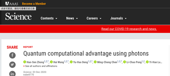 这篇论文名为「用光子实现量子计算优越性」(Quantum computational advantage using photons)。