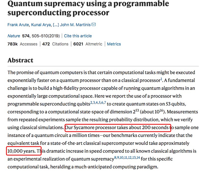 去年,谷歌利用「随机线路采样」这一特定任务实现了所谓的量子霸权。在世界第一超算 Summit 需要计算 1 万年的实验中,谷歌的量子计算机只用了 200 秒。这一论文被发表在Nature上: