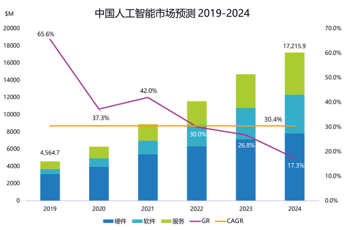 先来看一组数据,2020年,整个中国的人工智能市场规模是63亿美元,据IDC预测,到2024年,这个数字将会达到172.2亿美元。而且,虽然今年受到疫情影响,但中国AI整体市场仍然保持着37%的增长。