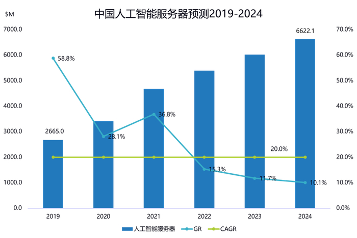 人工智能芯片将继续呈现多样性的发展,GPU依然是数据中心加速的首选,占有95%以上的市场份额;中国人工智能服务器将在未来五年保持高速增长,是整体服务器市场增长的核心驱动力;