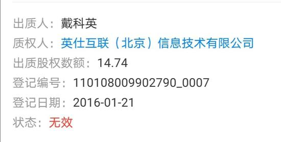 但是,如果我们查询资料的时候细心一点,就会发现直到2016年2月,戴科英都是作为股东出现在猎聘网的招股信息里的,而今天在猎聘网的股东信息中已经找不到戴科英的名字了,戴科英的股权出质也已经是无效状态。