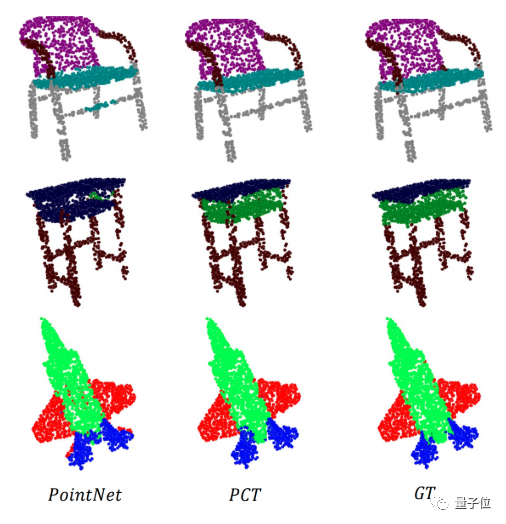 从实际对比情况来看,三种PCT网络结构的分割效果,都要比PointNet的效果好得多(最右边为初始模型)。