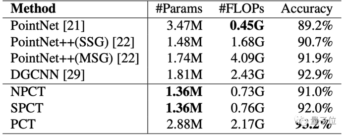 其中参数最大的PCT,精度也达到了最高的93.2%,如果更侧重于小型参数量,那么NPCT和SPCT则在1.36M参数的情况下,精确度分别达到了91%和92%。