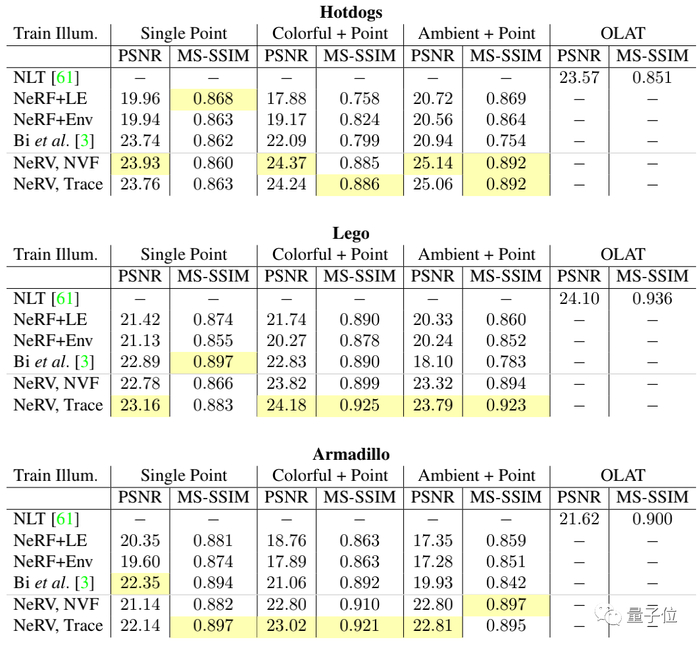 在最后的测试结果上,NeRV的表现远远超过了NeRF和NLT: