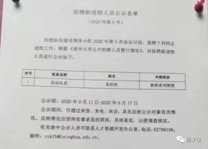 而在北大官宣朱松纯入职之前,还发生了一个小插曲:一张清华大学《拟聘新进校人员公示名单》被曝光。