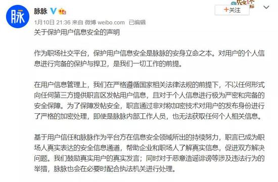 1月10日,拼多多一员工因在脉脉发布匿名消息被开除事件,引发热议,部分网友质疑脉脉是否泄露用户个人信息。对此,脉脉在官方微博回应称,不会以任何形式向任何第三方提供职言区发帖用户信息,且对于个人信息进行极为严密和完备的安全保障。