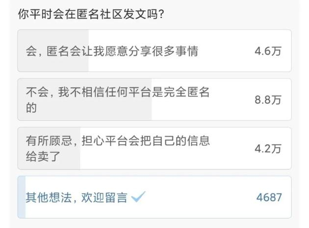 因此,从最近的“你平时会在匿名社区发文吗?”投票结果来看,选择“不相信任何平台是完全匿名的”以及“顾忌平台卖了自己信息”的人数,是选择“会”人数的近3倍。