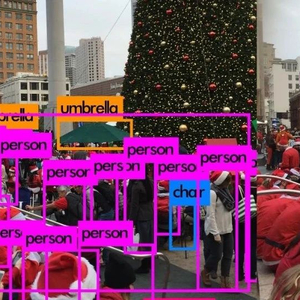 由于在导出的时候ONNX格式文件时模型的推理得到的三个输出层原始结果,所以还需要对每个数据先完成sigmoid归一化,然后再计算相关值,这部分的代码实现我参考了项目中的yolo.py中的Detection部分,得到初始每个对象的检测框之后,采用OpenVINO中自带非最大抑制函数,完成非最大抑制,就得到了最终的预测框,然后绘制显示。