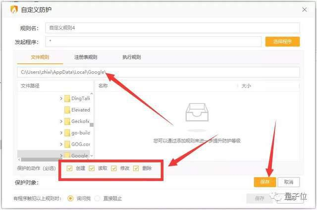 在“添加规则”-“添加保护对象”中,输入要保护的目录(想要保护的所有文件夹),并选中所有的保护动作: