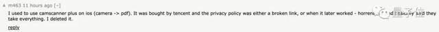 有网友表示,不知道是不是巧合,自己曾经在iOS上使用camscanner plus,这是个腾讯收购的软件。