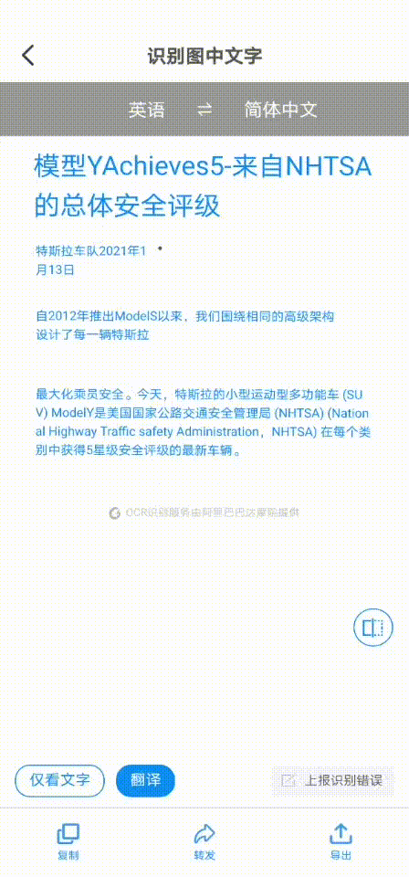 不只是针对文字对话、文档,结合OCR技术,对于聊天中的图片文件,钉钉同样可以一键识别文字并翻译。