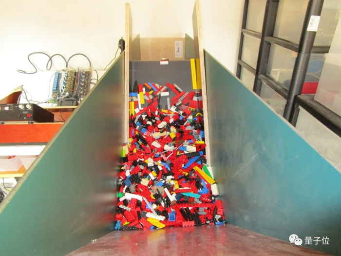首先把一桶乐高积木倒入分类器中,在履带的传送下,积木分批少量地落入V形槽。