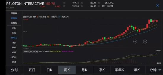 Peloton的股价也一路走高,截至1月22日美股收盘,股价已达159.75美元,是上市时的近10倍。