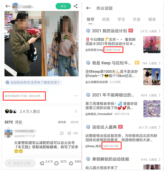 另外不得不吐槽,Keep作为“社区”都不合格。Keep首页“动态”标签下推荐的内容经常是2020年甚至2019年的;“热议话题”下考前的回复也都“跨年”了。这说明Keep的社区非常不活跃,长期无法产出热门内容。