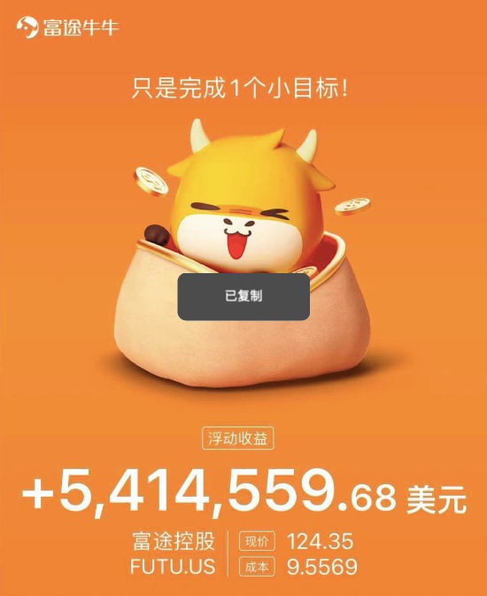 在2021年的10多个交易日里, 亿航智能大涨324%,富途大涨123.52%,小牛大涨75.29%。不少投资者在这三家公司赚了大钱,一位来自富途投资者交流群的群友晒出的截图显示,其在富途这只股票的浮动收益高达541万美元,大约3500万人民币,这是一个可以在中国大多数城市实现财务自由的数字。