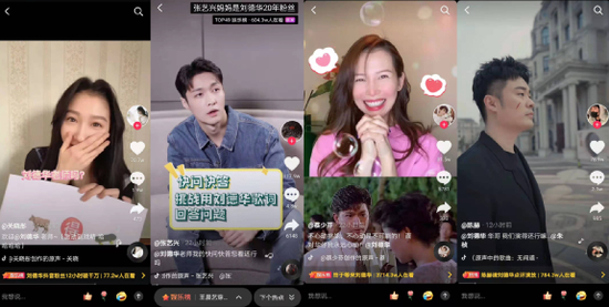 在刘德华发布首条短视频后,一向自称是刘德华粉丝的贾玲激动的在评论区大喊“榜一给姐让出来!”,引得超200万用户为“明星追明星”的有趣评论点赞。陈赫、应采儿、关晓彤纷纷发布了致敬刘德华电影名场面、向刘德华喊话欢迎其入驻的视频;张艺兴、容祖儿则是以快问快答的方式回顾了刘德华的众多经典歌曲;而蔡少芬更是玩起了当下正火的“不心动挑战”,在刘德华出现后激动地喊出了“华仔我爱你”。