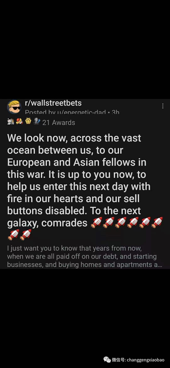 收盘后,有WSB用户发文指责华尔街空头们依靠剥削别家公司、操纵市场和媒体来获取暴利,但是散户们不会屈服,因为这些人聚集起来是能改变人生的庞大资金,这会将富人手中的财富重新分配给穷人。