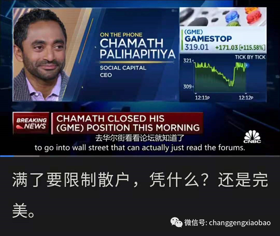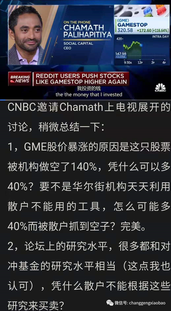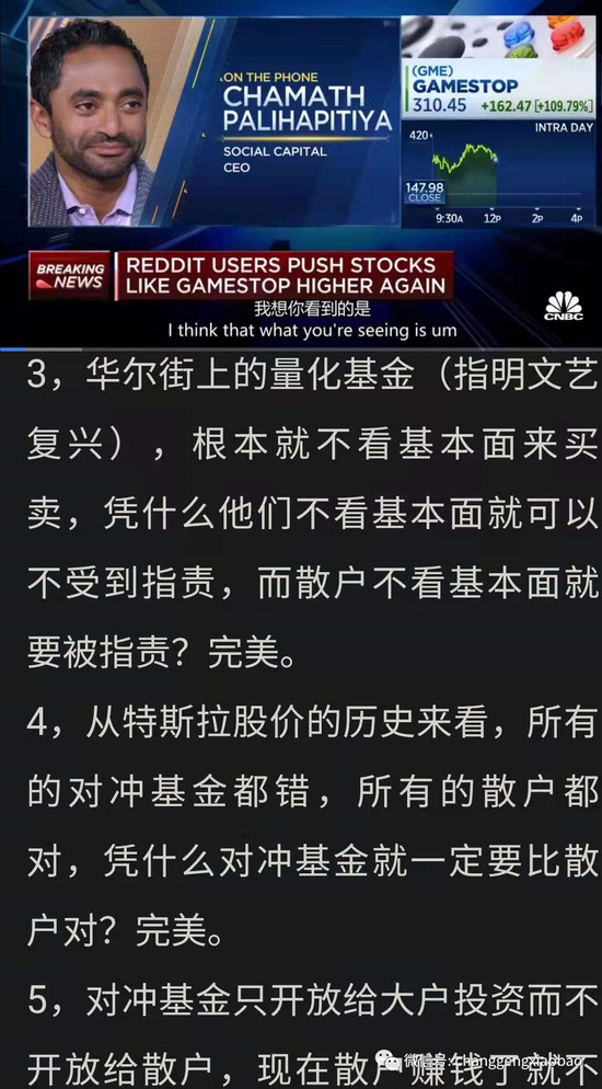比如在电视节目中公开为散户站台的传奇投资人Chamath Palihapitiya,他自己就是本次做多GME的领军人物之一,但却不是散户。(另一个领军人物马斯克去年也曾因为特斯拉被做空而号召群众组织起来爆锤空头)