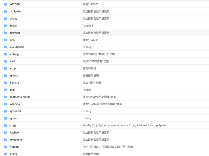 结构清晰:本项目的所有数据源相互独立,可移植性高,所有爬虫脚本在项目的 Spiders 文件下。