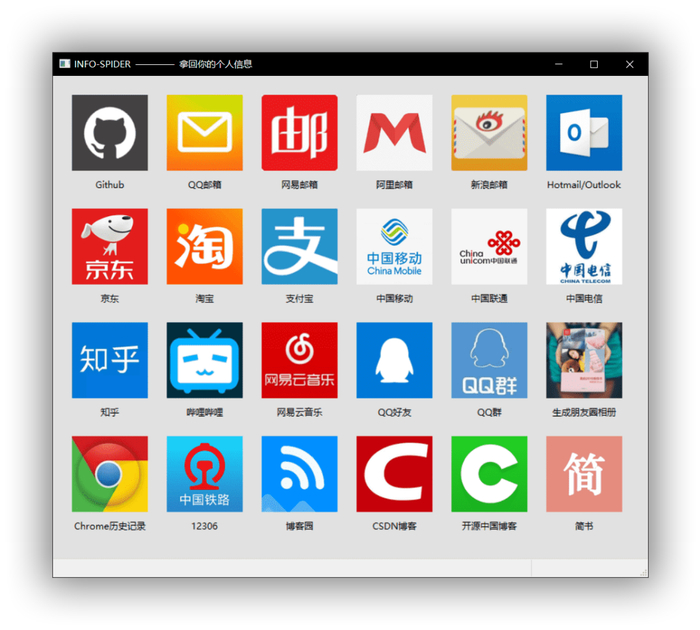 目前支持数据源包括GitHub、QQ邮箱、网易邮箱、阿里邮箱、新浪邮箱、Hotmail邮箱、Outlook邮箱、京东、淘宝、支付宝、中国移动、中国联通、中国电信、知乎、哔哩哔哩、网易云音乐、QQ好友、QQ群、生成朋友圈相册、浏览器浏览历史、12306、博客园、CSDN博客、开源中国博客、简书。