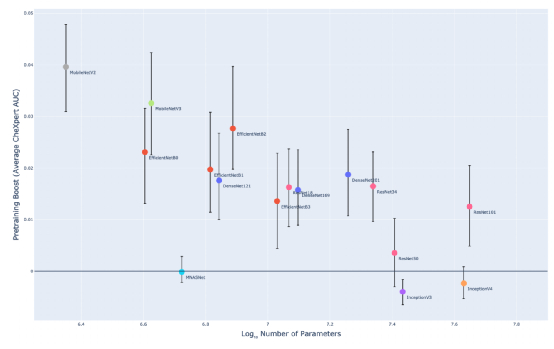 团队发现 ImageNet 预训练对大多数架构(AUC 均值为 0.015)提供了有意义的提升。并且斯皮尔曼系数为