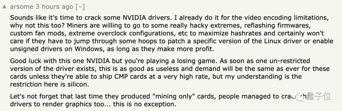 有不少网友指出,恐怕矿主们不会乖乖去买CMP,而是会破解英伟达检测以太坊算法的驱动程序。
