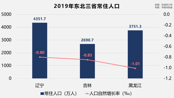 因为东北人口问题已经很严峻。据统计公报,辽宁、吉林和黑龙江三省在2019年年末常住人口分别减少7.6万人、13.33万人和21.8万人,总共减少42.73万人。三省人口自然增长率均为负值,分别为-0.80‰、-0.85‰、-1.01‰。