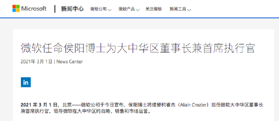 微软公司于今日宣布,侯阳博士将接替柯睿杰(Alain Crozier)担任微软大中华区董事长兼首席执行官,这是微软中国区在连续两位外籍CEO后,再次回归中国面孔。