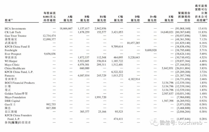 IPO前,Guo女士直接持股为16.3%,武汉瑞伏、宁波新岳及Panacea持股为13.83%,HCA Investments持股为13.41%,CK Lab Tech持股为13.83%;Guo Trust受托人持股为7.5%;
