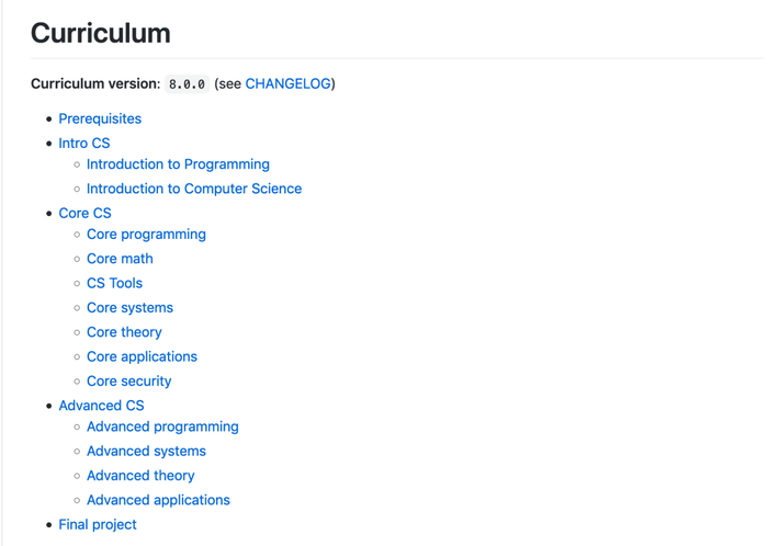 为了简单起见,官方建议由从上到下的的顺序来学习(特别是核心CS),因为他们已经按照这些课程的预备知识,对其进行了拓扑排序。