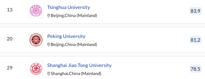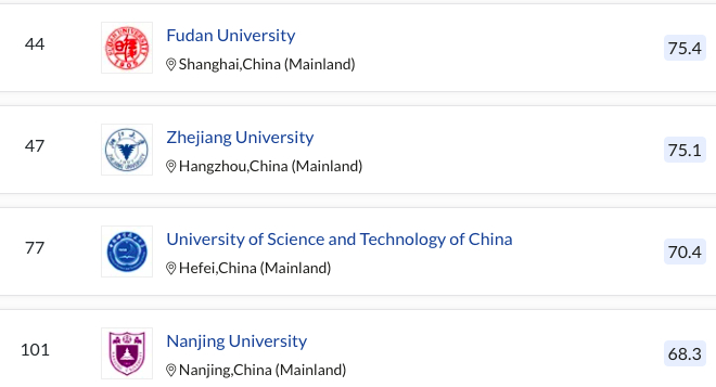 全球高校前100名中,中国大陆高校还有上海交通大学,复旦大学、浙江大学、中国科学技术大学。