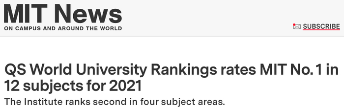 在去年6月份发布的2021 QS 世界大学排名中,麻省理工学院(MIT)位列第一,已经连续9年稳坐霸主地位。