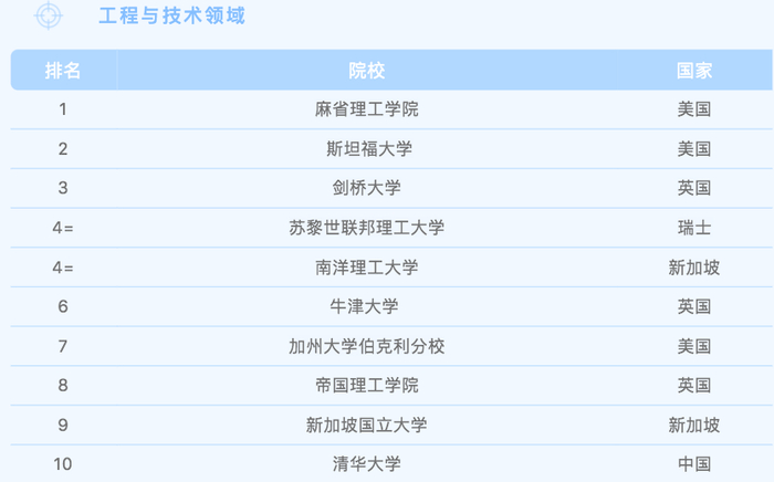 工程与技术领域中,除了前三名霸榜的美国高校,还有新加坡国立学校和清华大学也上榜,实力不可小觑。