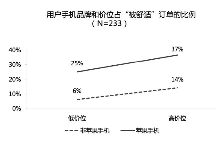 此外,苹果手机用户收到的优惠券会比较少,平均2块钱,不到安卓手机的一半。这样的差异不仅存在于苹果手机用户与安卓手机用户之间。根据报告分析,同样是安卓手机的用户,手机价格越贵,叫来舒适型车辆的概率就越大,当然价格也贵不少。