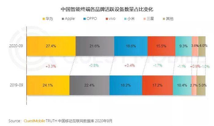 根据QuestMobile的数据,截至2020年9月,在国内智能手机的市场份额中,安卓系统分走了近八成的蛋糕,而苹果手机的占比下降到21.6%。