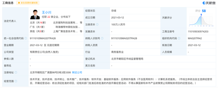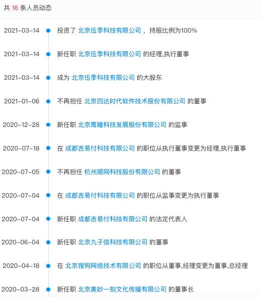 2020年3月5日,国家企业信用信息公示系统披露,搜狗CEO王小川北京伍季科技出任董事一职。