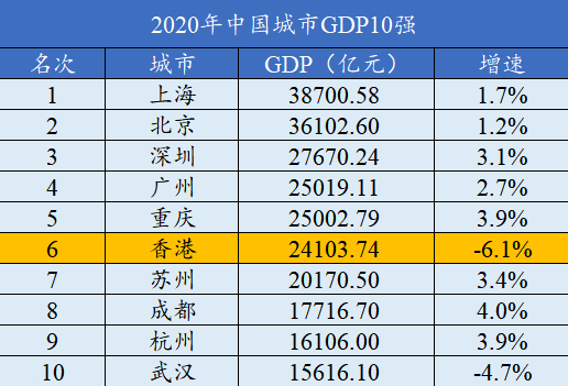 就在上个月,香港公布了2020年的GDP数据——2020年香港实现本地生产总值27107.3亿港元(大约相当于人民币2.4万亿元),同比实质下跌了6.1%。