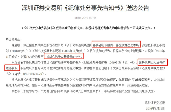 2019年5月深交所发布《纪律处分事先告知书》送达公告称,毕士钧在担任暴风集团股份有限公司董事会秘书期间,存在涉嫌违反相关规定的行为,拟对毕士钧给予公开谴责的处分。但暴风却反馈说集团无法与毕士钧取得联系。