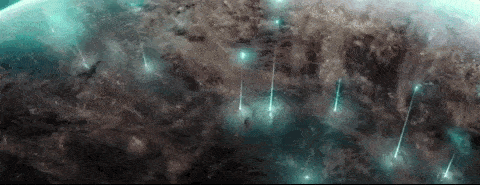 一艘闪烁着灯光和蔚蓝色光芒的星舰悬浮在空间与时间的终极领域,伴随着空间的扭曲,隐没在远方熠熠生辉的星光之中。