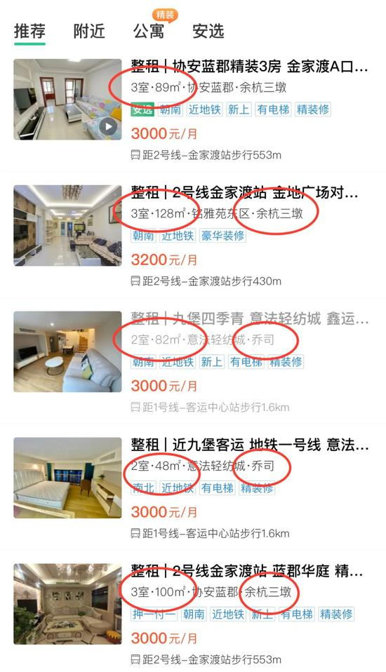 更有趣的是,在安居客平台上可以发现,偌大一个杭州,不同地理位置、不同户型、不同面积的房子,出租价格确实意外的一致,全部在3000元左右,上下浮动不超过300元。并且所有诸如此类的房源信息都在搜索列表或者推荐列表的前列,足见价格虚标的范围之大。