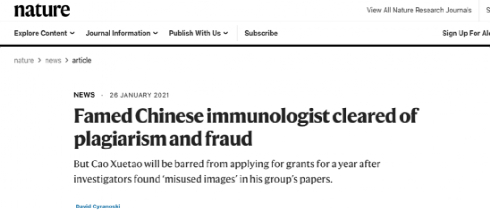 1月26日,《自然》发表了一篇题为《中国著名免疫学家曹雪涛没有剽窃和造假》的新闻。
