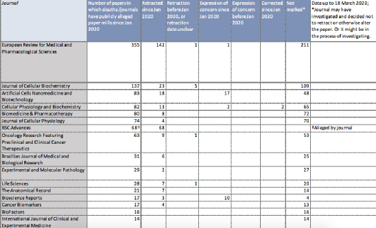 到目前为止,被怀疑来自造纸厂的文章中,约有26%被撤回或贴上关注的标签。许多其他仍在调查中。例如,《细胞生物化学杂志》(JCB)在2月1日宣布,去年,编辑们调查并撤回了涉嫌包含图像处理的137篇论文中的23篇。