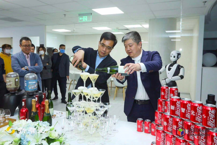 在新智元AI家晚宴上,达闼科技副总裁葛颀与科大讯飞执行总裁胡郁一起倒香槟塔庆贺。