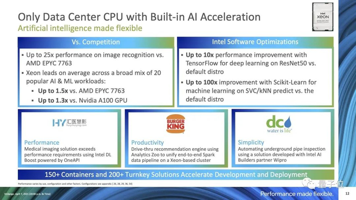 英特尔表示,最新至强处理器与64核心的EYPC 7763相比,在这20个AI工作负载上的性能提升了1.5倍,甚至相比英伟达A100 GPU表现出了1.3倍的优势。